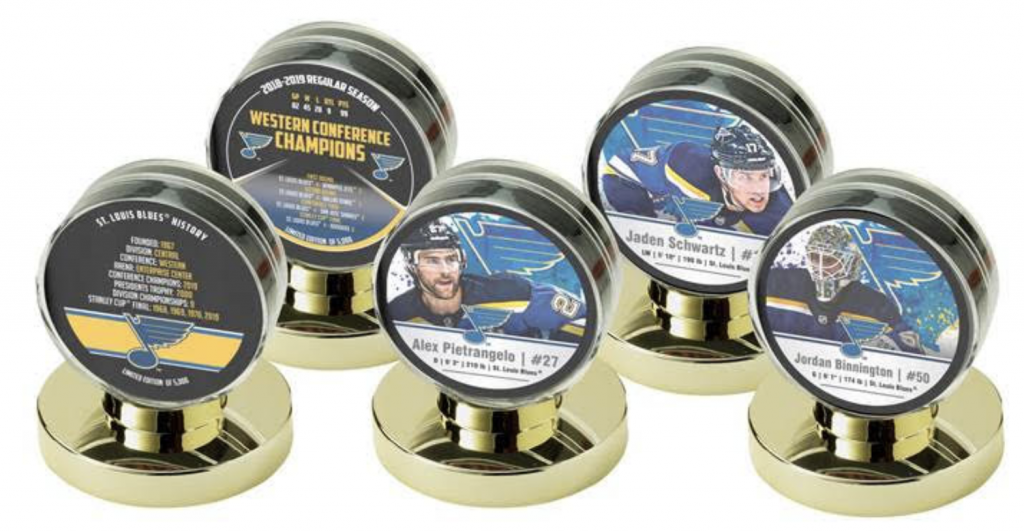 The thing that makes the Five Puck Set so special is each set will have one puck that commemorates the Blues Western Conference Championship as well as round by round results. As a consequence, it won’t ship until the results of the Stanley Cup Champion are known.