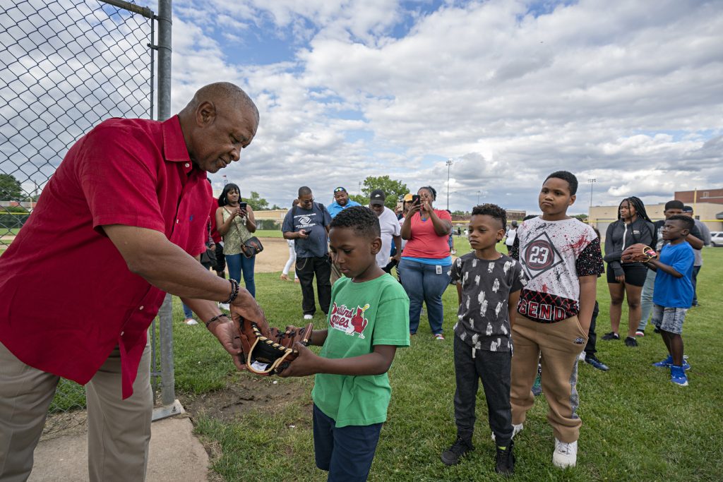 The 15-time All-Star and 13-time Gold Glove winner spoke with the group of 40 or so children about the importance of always trying your best, presented each with a new Rawlings glove and baseball, and led the group in a game of catch.