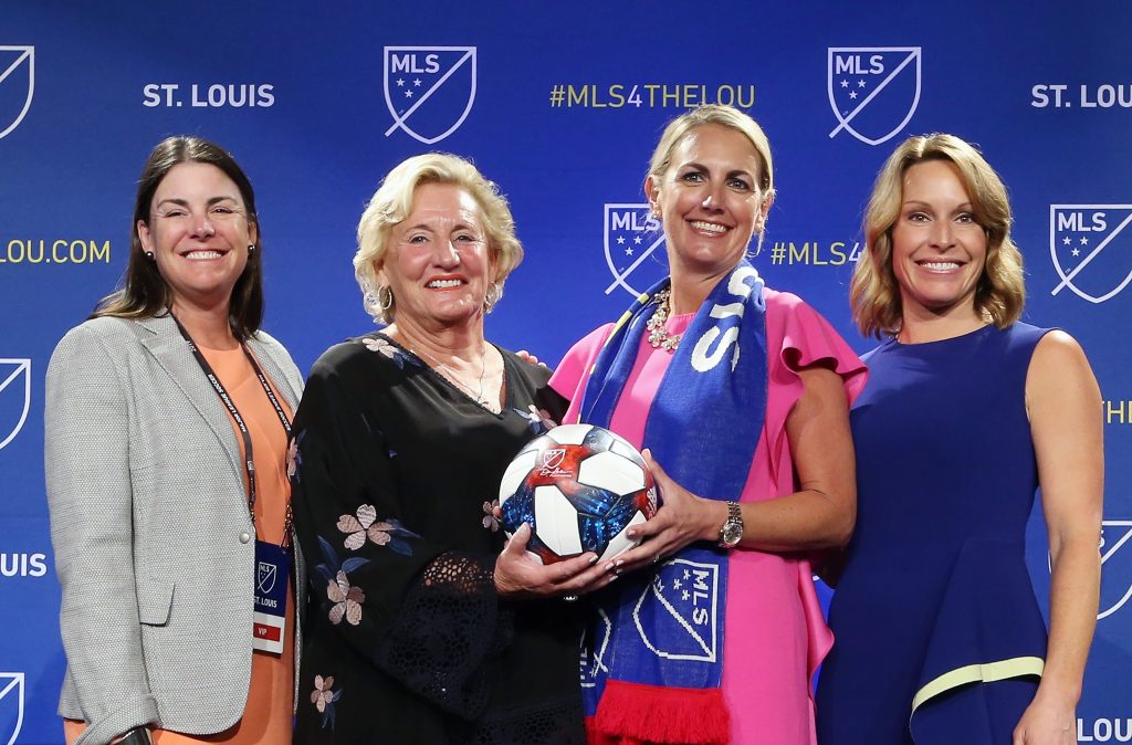 Four members of the new St. Louis franchise ownership group posed for photos following the announcement ceremonies that St. Louis has been awarded an MLS franchise. Owners from (L to R) are Patty Taylor, Jo Ann Taylor Kindle, Carolyn Kindle Betz, and Chrissy Taylor. This group is the only all female owned franchise in Major League Soccer.