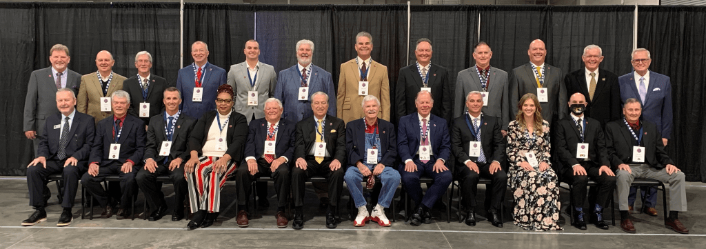 MSHOF Class of 2021: Front row, from left: Chairman Kris Conley, Warrensburg coach Ron Clawson, Edwin Evers, Pat Colon, Edwin “Cookie” Rice, Carl Peterson accepting on behalf of the late Derrick Thomas, Bobby Allison, Emily Dryden accepting on behalf of the Missouri State Sugar Bears, Bryan Blitz, and Bill Caputo accepting on behalf of the Poplar Bluff High School Boys Golf Program. Back row, from left: Executive Vice President Marty Willadsen, Tom Mast, Jim Whytlaw, Jim Middleton, Alex Hall, Paul Evans, Dennis Heim, Dan Boever, John Roderique, Jeff Montgomery and Rich Montgomery representing the Mizzou Football Chain Crew, and President and Executive Director Jerald Andrews.