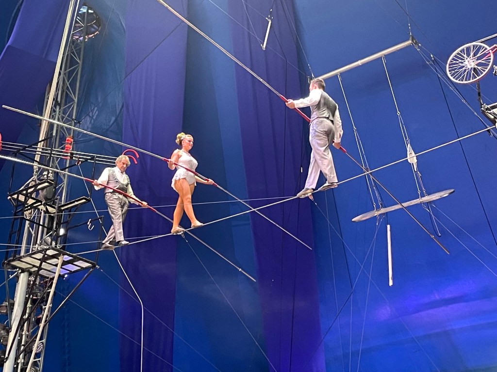 When asked about his family became specialized on the high wire, Alex said. “Our family has been in the circus for two hundred years. We’ve been walking the hire wire for about the last 100 of those years, which began with my great-grandfather, Karl, who was initially was a hand balancer (handstands). At the time, it was doing the Great Depression (1930s) and work everywhere was scarce. Karl would go to beer hall to beer hall performing hand stands for tips to help support his mother, brothers, and sister. He got into wire walking when he answered a newspaper ad in for a hand balancer. When he answered the ad he was asked to do a handstand on the feet of a tight rope walker while he laid on his back on a 50 feet high wire. My grandfather told him he was insane and left. But times were tough, so he returned and took the job.”