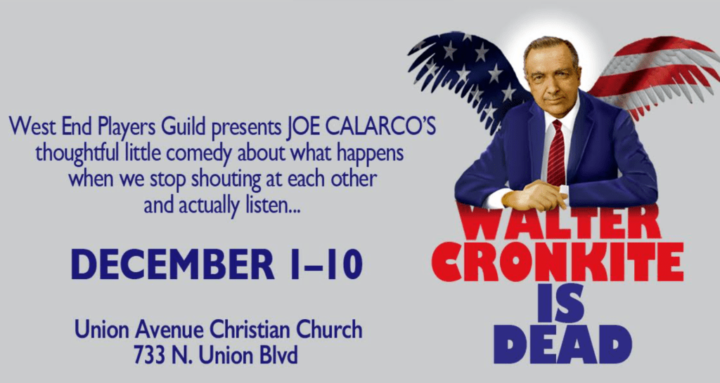 Those who enjoy live entertainment will want to check out this upcoming sage play December 1,2,3 & 7,8,9,10 as the West End Players Guild’s 112th season launches December 1st with Joe Calarco’s Walter Cronkite is Dead, directed by Anna Blair and featuring Kate Durbin and Leslie Wobbe.