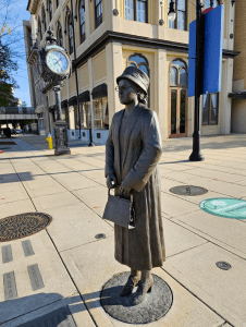 The monument for Parks is a life-size statue. Seeing her little body with her coat on and purse in her hand standing on the corner as if waiting for the bus to come, is very moving and more inspiring than a grand monument in front of a museum could ever be.
