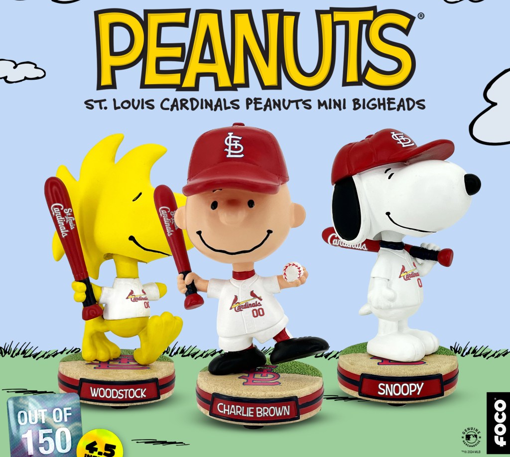 FOCO has released their new St. Louis Cardinals Charlie Brown, Snoopy, and Woodstock Mini Bighead Bobbleheads
