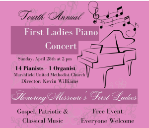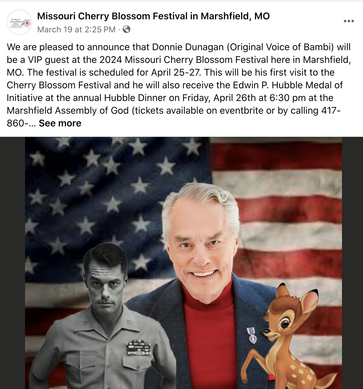 6:30 PM- Edwin P. Hubble Medal of Initiative Dinner presenting Marshfield’s highest honor to several outstanding Americans. Honoring: Donnie Dunagan (Original Voice of Bambi), Clifton Truman Daniel (Grandson of President Harry S Truman), Andrew Greer (Dove award nominated singer, songwriter, and producer) and Massee McKinley (Society of Presidential Descendants)- Marshfield Assembly of God Fellowship Hall- Tickets are $30 per person and can be purchased online (Eventbrite) or by calling 417-860-4996.