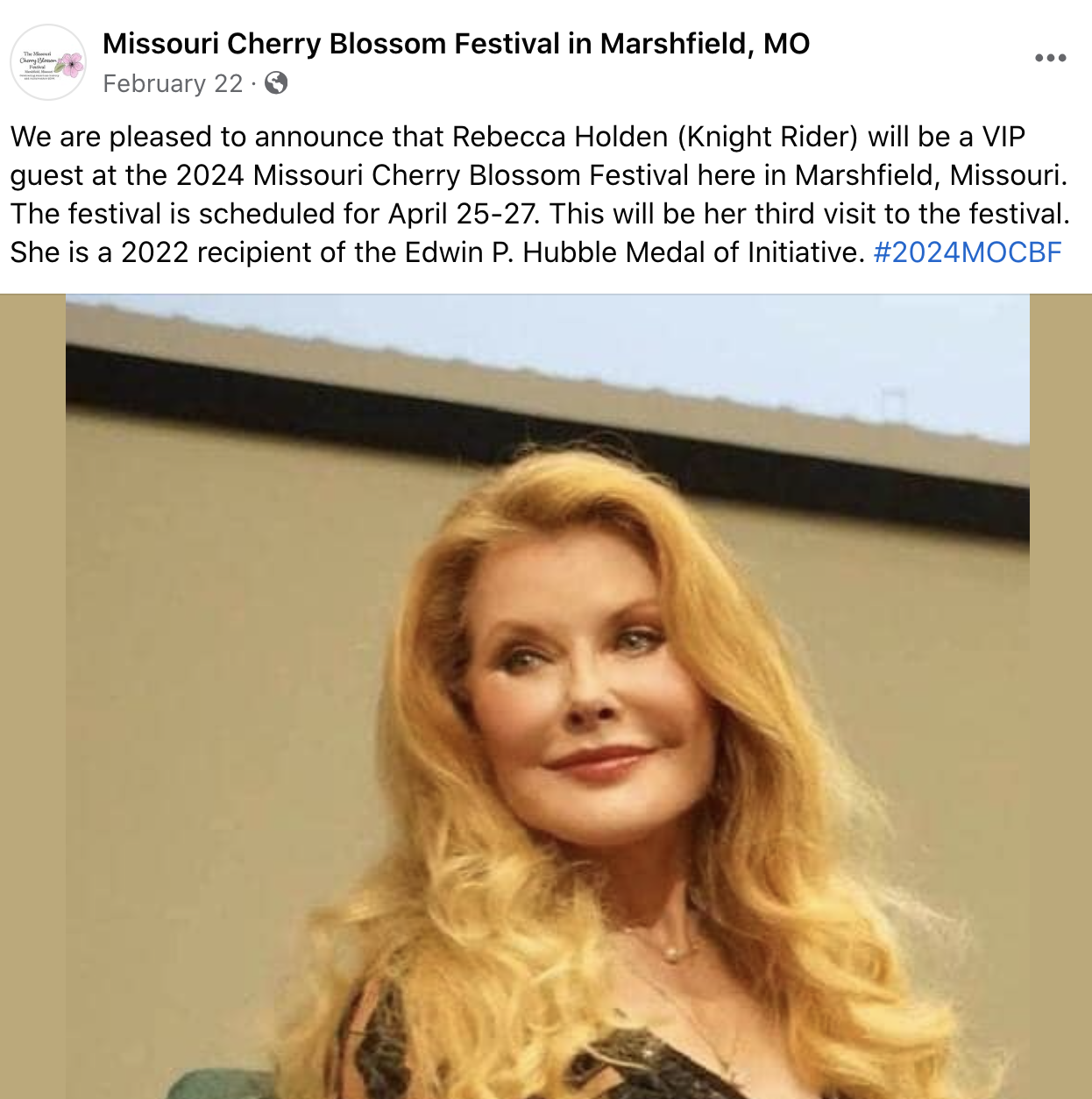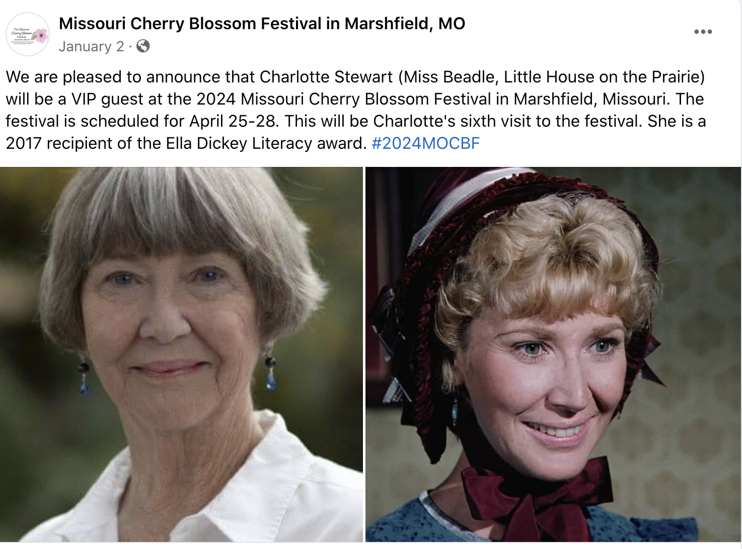 2:30 PM- Cherry Blossom Tea: Lesley Ann Warren (Cinderella, Rodgers & Hammerstein’s-1965) will speak at the Cinderella-themed tea- Hats are highly encouraged for this event- Marshfield Community Center- Lesley Ann Warren will be a VIP guest at the 2024 Missouri Cherry Blossom Festival here in Marshfield, Missouri.