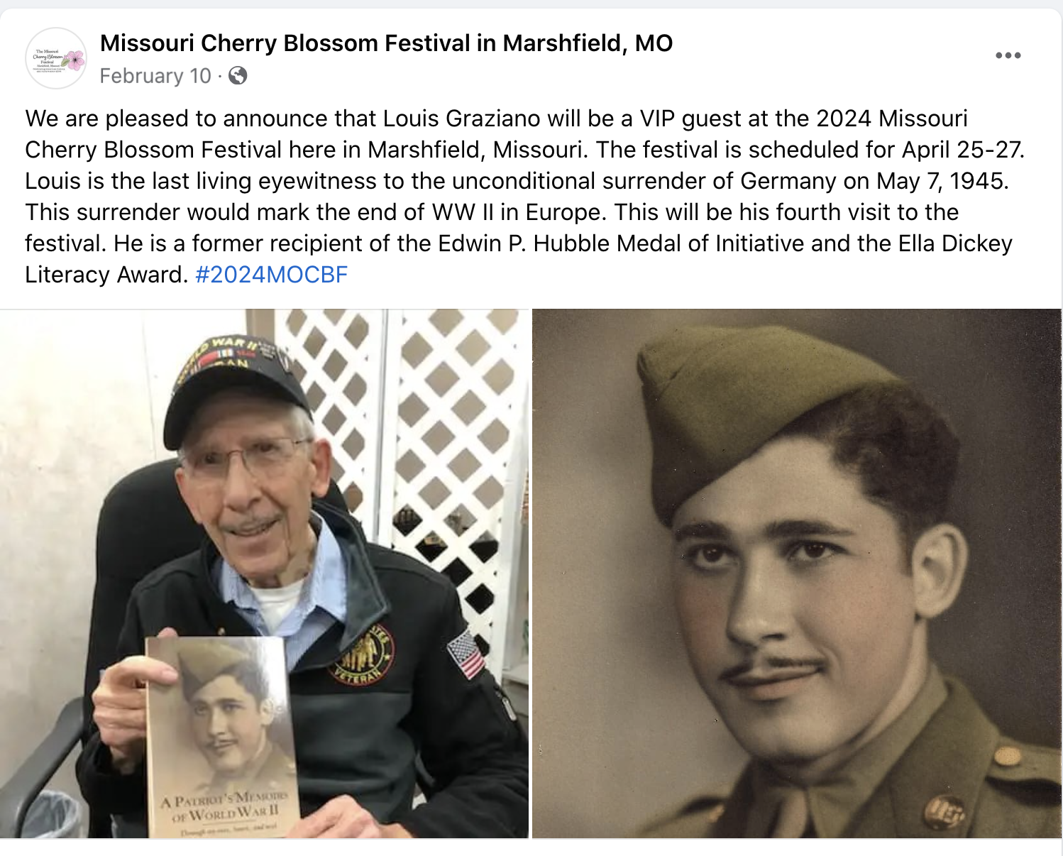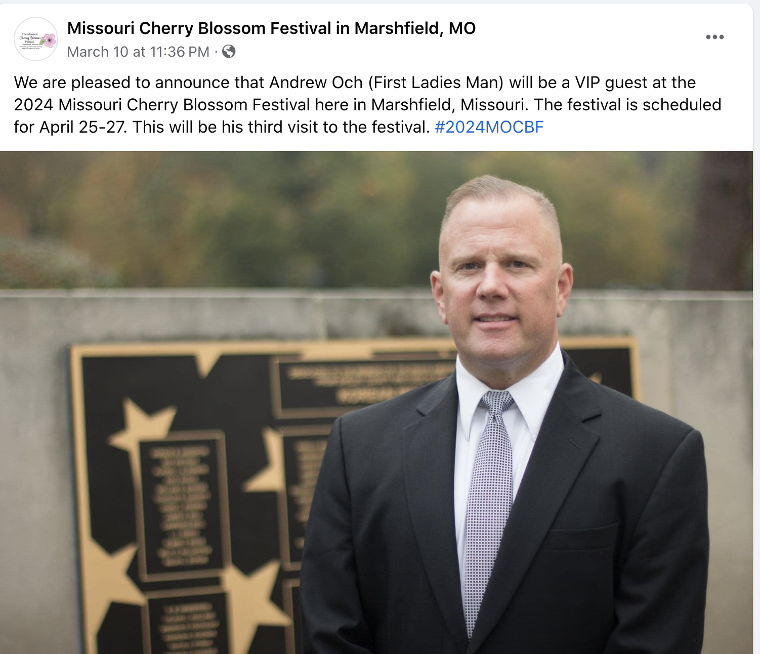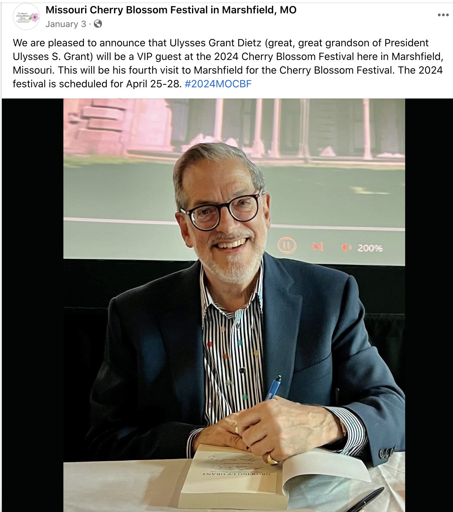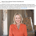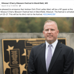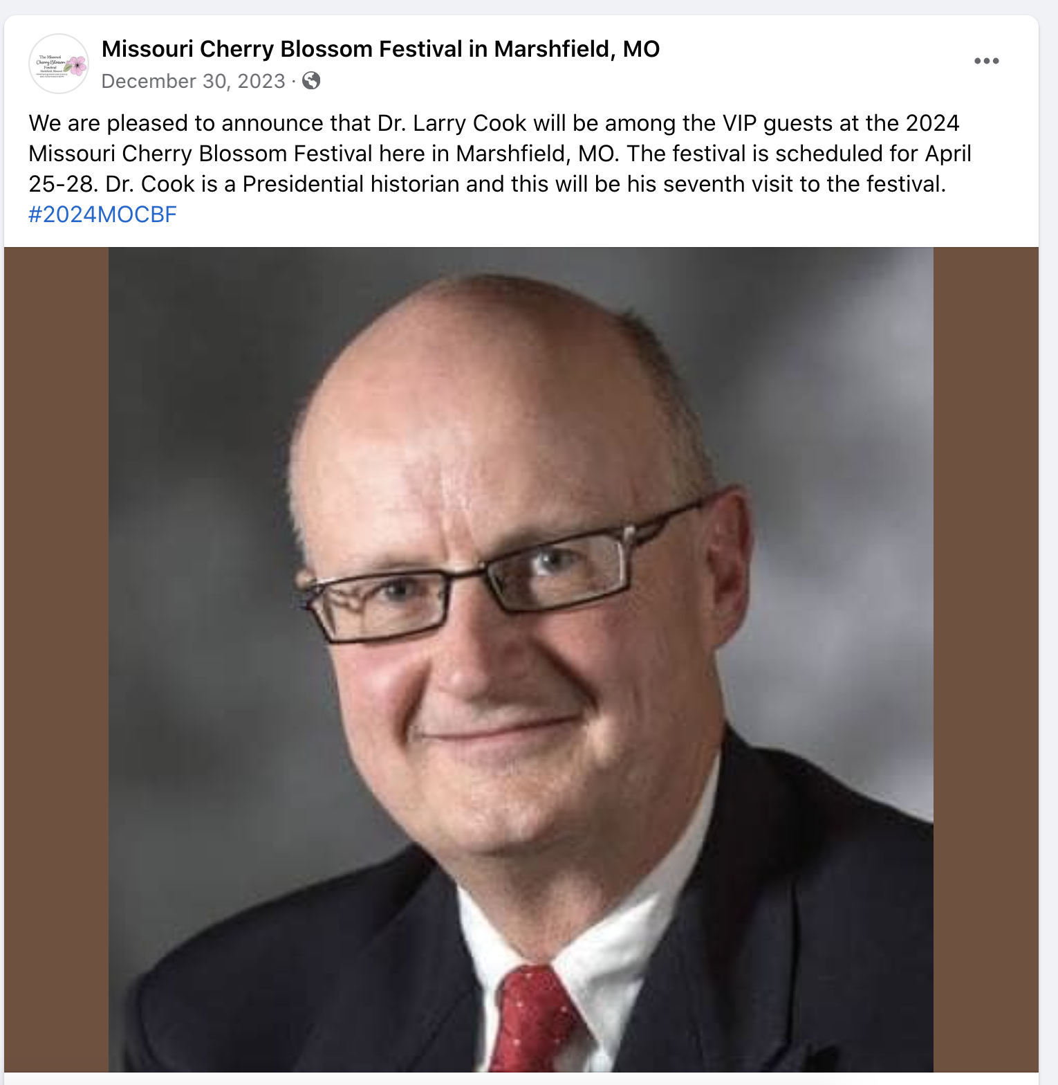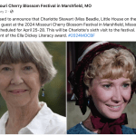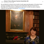The Missouri Cherry Blossom Festival in Marshfield, MO always offers so much. It is a hodge-podge of part Presidential history and part pop culture history. Descendants of U.S. Presidents congregate in Marshfield and there are often roundtable discussions about various topics. Along with the Presidents, the Festival is big with First Lady history. In fact Laura Bush attended one year with both her twin daughters, Barbara Pierce Bush and Jenna Bush Hager.
