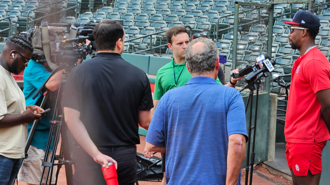 The Memphis Redbirds had him available for a media scrum (shown in photo at top of article). He said he was happy with his progress and could see improvement in his approach.
