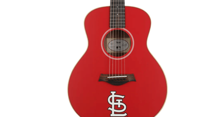 The website says Taylor is “on deck” with their new collection of officially licensed GS Mini guitars featuring the colors and logos of all 30 Major League Baseball teams. The Cardinals guitar is bright red with the St. Louis Cardinals logo o it.
