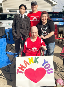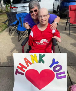 Brendan and his brother Caden, along with their parents Michelle and Michael Schmitt and many family members and friends watched the parade from their driveway in O’Fallon, Missouri. Brendan had made a sign to thank everyone involved in the parade.