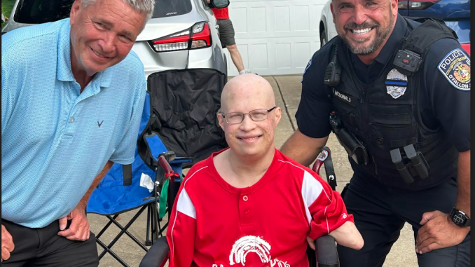 Tuesday started out rainy and wet but later in the afternoon the sun came out and the skies cleared up just in time for a special drive-by police and fire parade that was organized by Sherry Opich a volunteer with Rainbows for Kids. The parade which included police cars, fire engines, police motorcycles, and friends driving their own cars– all to bring joy to Brendan Schmitt a young cancer patient who is facing a tough road ahead.
