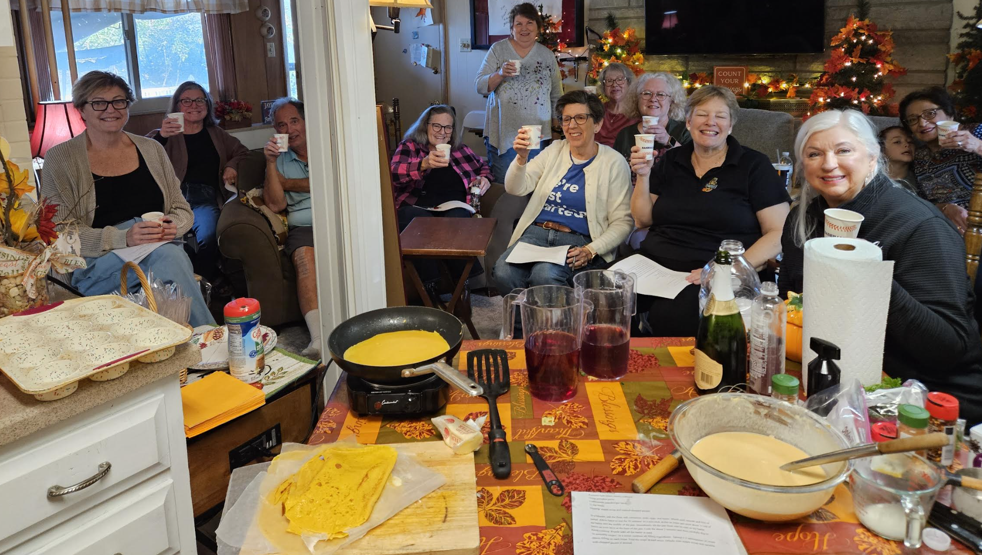 You can choose just one thing or try all of them. She starts off with a cranberry cocktail drink, which can be alcoholic or non-alcoholic, depending on your crowd. She has crepes, an egg dish, a strata which could actually be used as a vegetarian Thanksgiving main dish, a cake desert and more.