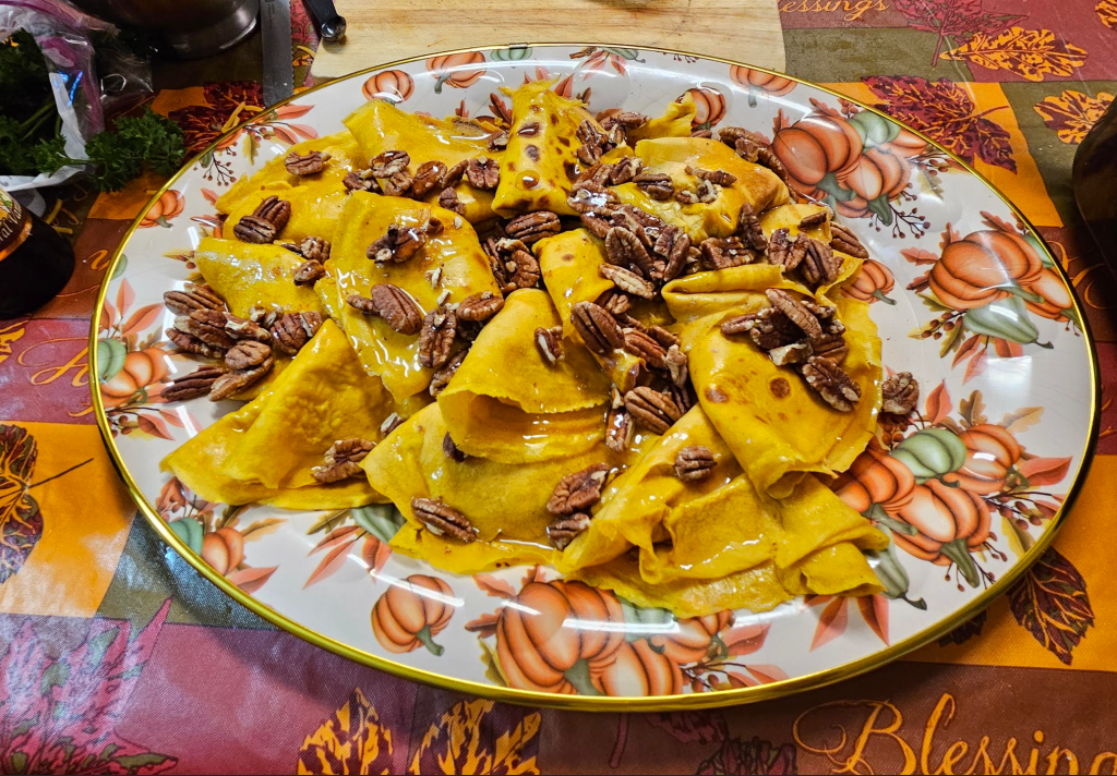 Pumpkin Cream Cheese Crepes with Maple Pecan Syrup