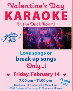 Friday, February 14 from 7-11 p.m: Drown your sorrows or toast to new love – it’s breakup songs or love songs ONLY at Valentine’s Karaoke in the Duck Room at Blueberry Hill. This event is free for adults 21 and over. Details at blueberryhill.com