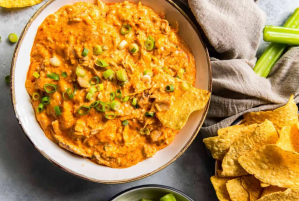 Serve with tortilla chips and celery sticks, garnished with green onions and/or blue cheese crumbles, if desired.Sliced green onions,Crumbled blue cheese