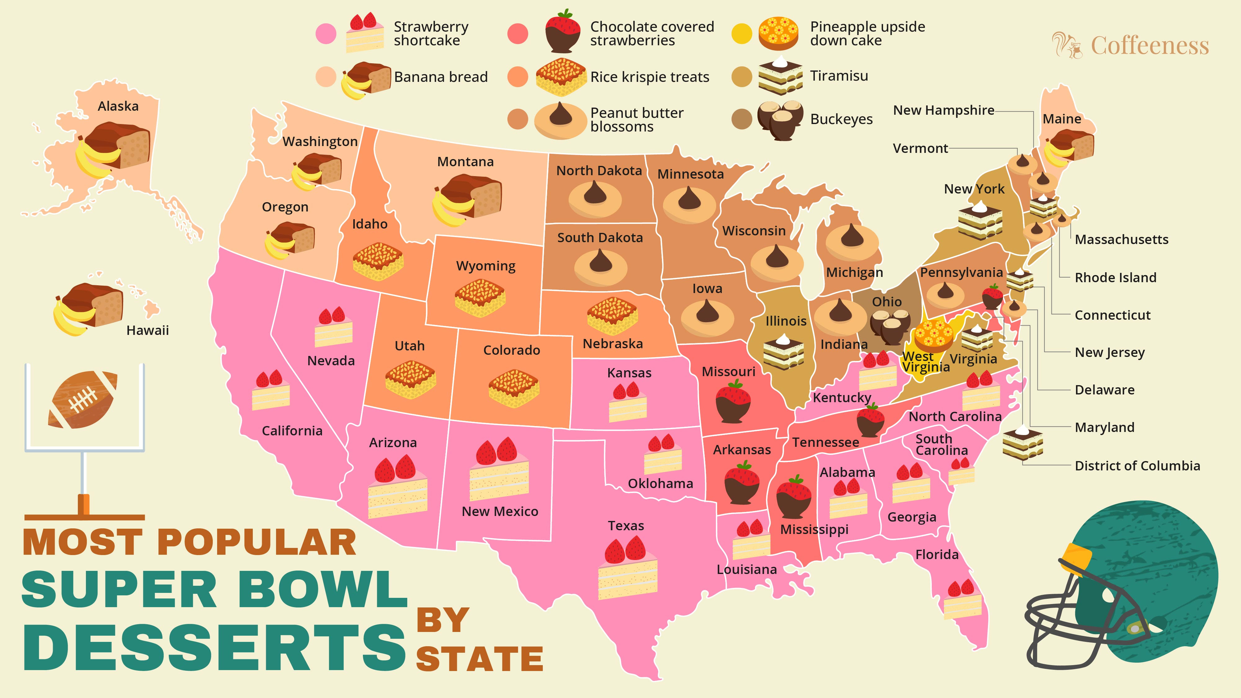 - In the dessert category, strawberry shortcake leads the pack as the most-searched Super Bowl dessert in 14 states, followed by peanut butter blossoms in 13 states.