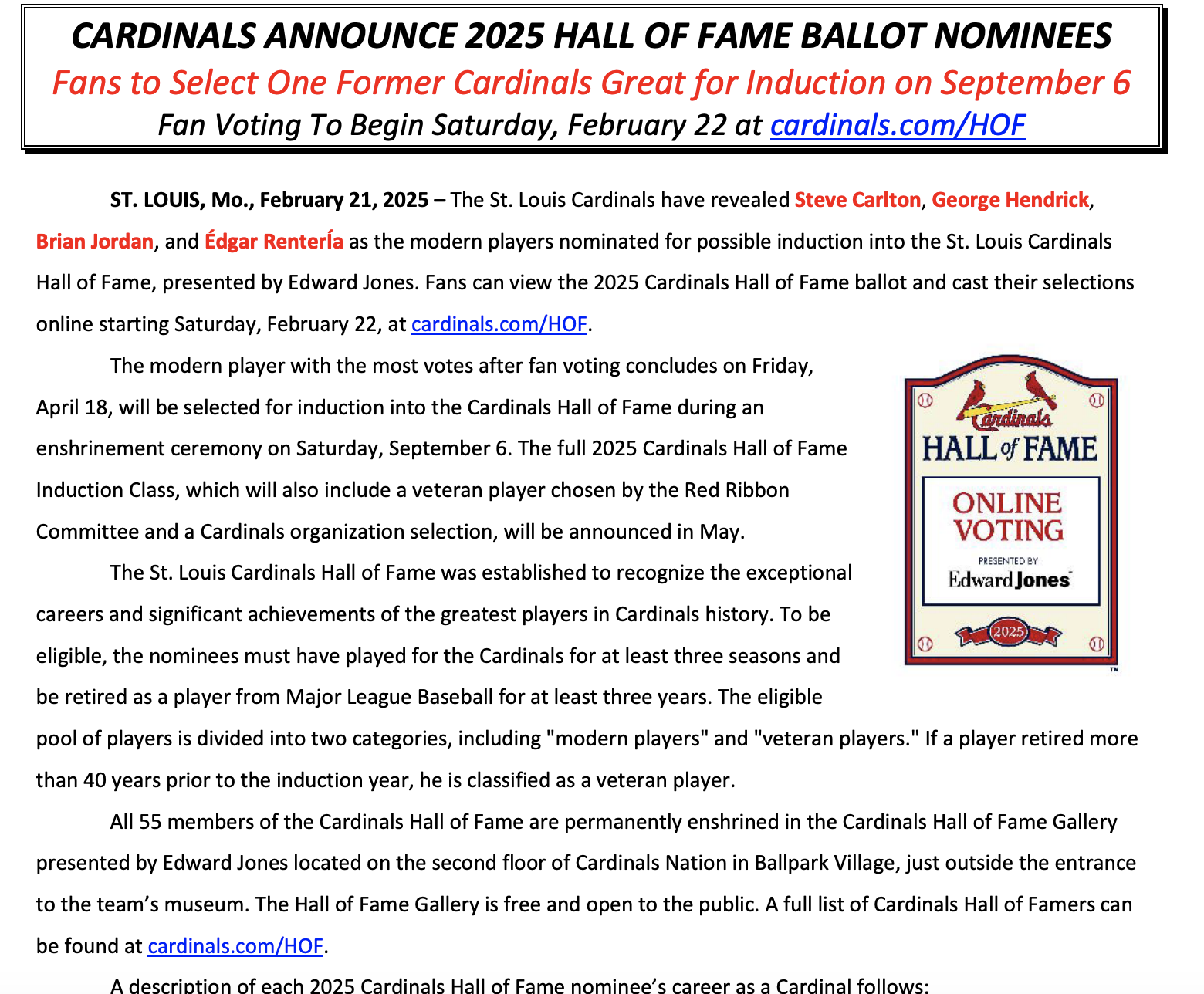 The Cardinals Hall of Fame Induction Ceremony will take place at 3 p.m. at FOX Sports Midwest Live in Ballpark Village on Saturday Aug. 25, 2019. The ceremony is free and open to the public […]
