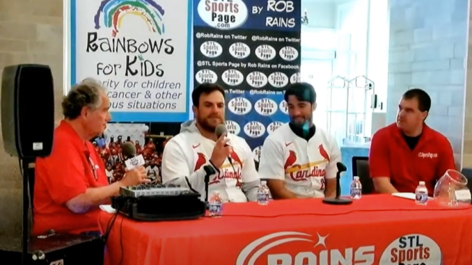 This year as a new part to the event was the filming of the “Rains on the Cardinals” Podcast –and Mike Rains (shown in photo, right, with the players)  served as emcee. Rob Rains handled the interviews with the players. Fans had a great time asking questions to the players as Mike took the microphone out to them.