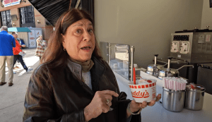 Along with the great food, there are new vendors including Freddy’s. She is shown testing a sundae from Freddy’s.