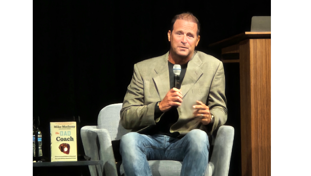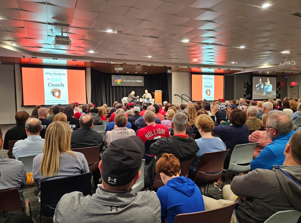 Former Cardinals catcher and Cardinals and Kansas City Royals manager Mike Matheny entertained a crowd of about 300 people in the auditorium of the St. Louis County Library on Friday March 28, 2025. He was there to talk about his new book, “The Dad Coach: How to Lead Kids to Succeed On and Off the Baseball Field”