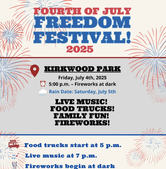 Celebrate Independence Day in Kirkwood style at the annual Fourth of July Freedom Festival! On Friday, July 4, 2025, gather at beautiful Kirkwood Park for an evening filled with community spirit, great music, tasty food, and fireworks. In case of inclement weather, the event will be rescheduled to Saturday, July 5.