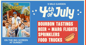 9375 Gravois Road, Affton, MO, United States, Missouri 63123Celebrate the Fourth your way at 9 Mile Garden with cold drinks, great food, and a laid-back atmosphere all day long. Bourbon tastings, beer flights, and margarita flights. Food trucks serving from open to close. First responder and military discounts as a thank you. Not in mood for Fireworks – Stick around for The Sandlot on the big screen at sundown