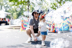 Children will enjoy a packed lineup of activities, including a giant bubble party, cultural crafts, inflatables, a petting zoo, and more—all designed for family fun. The photo, right, shows a father and child enjoying bubbles at the fourth annual St. Charles Jewish Festival. (Credit: Chabad Jewish Center of St. Charles County)