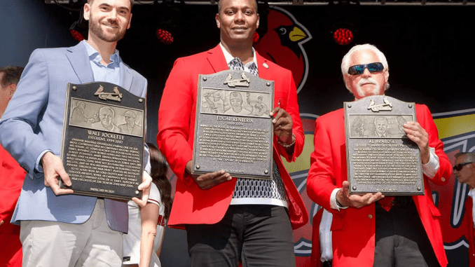 Édgar Rentería, Al Hrabosky & Walt Jocketty were enshrined in the Cardinals Hall of Fame, Saturday, Sept. 6. Hrabosky and Renteria was there but as Jocketty had passed away earlier this year, his son Joey accepted the award.