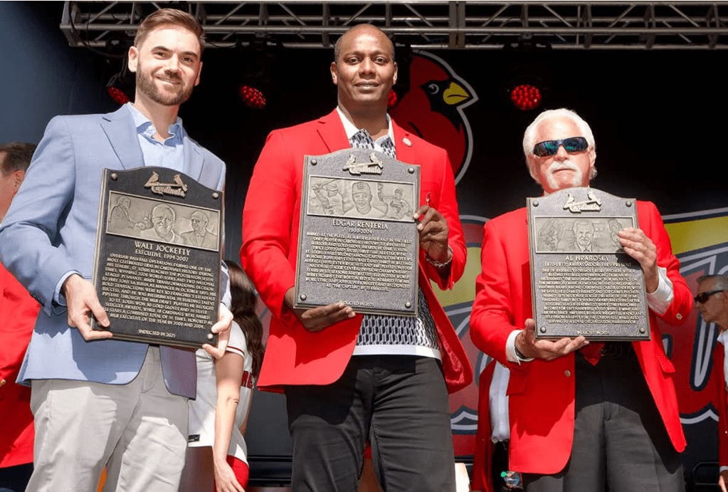Édgar Rentería, Al Hrabosky & Walt Jocketty were enshrined in the Cardinals Hall of Fame, Saturday, Sept. 6. Hrabosky and Renteria was there but as Jocketty had passed away earlier this year, his son Joey accepted the award.