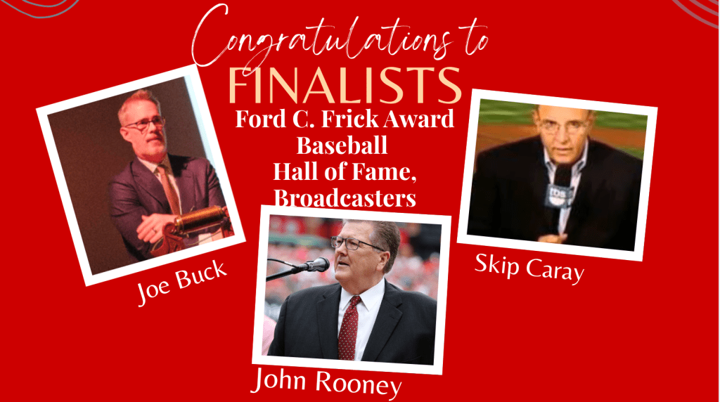 The 10 finalists for the 2026 Frick Award are: Brian Anderson, Joe Buck, Skip Caray, Rene Cardenas, Gary Cohen, Jacques Doucet, Duane Kuiper, John Rooney, Dan Shulman and John Sterling.