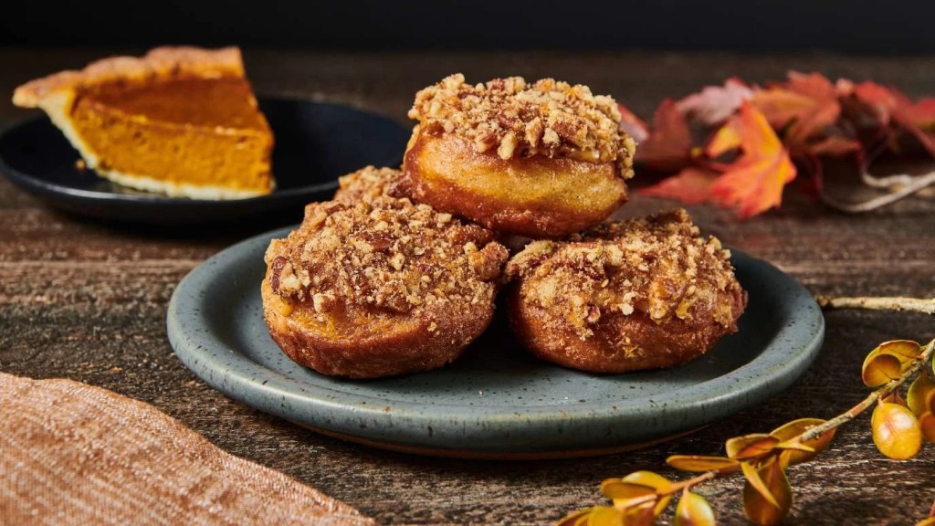 To fill doughnuts, use a wooden skewer or small paring knife to poke a hole in the side of each doughnut, being careful not to poke all the way through. Pipe Pumpkin Filling into prepared opening, dividing evenly among doughnuts. Once filled, dip top side of each doughnut in Glaze, allowing excess to drip off, then immediately dip to Pecan Topping. Turn right side up and place on wire rack to set. Serve immediately. Makes about 24