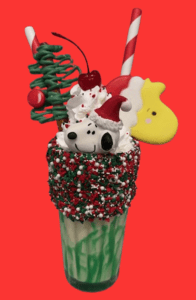 The ice cream creators at Soda Fountain, the retro-style diner at Union Station, have done it again. The over-the-top holiday Freak Shake for 2025 is called “Good Grief Christmas Freak,” a nod to the beloved story, A Charlie Brown Christmas. The treat is vanilla shake with green drizzle, vanilla icing and festive sprinkles, a black and white beagle-shaped yellow cake pop, a yellow bird sugar cookie and a Christmas tree chocolate pretzel rod.