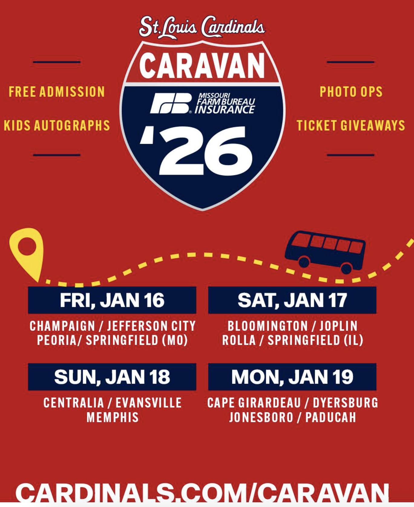 The Cardinals also announced the return of the Cardinals Caravan, presented by Missouri Farm Bureau Insurance. The annual traveling roadshow will bring current players, Alumni, and broadcasters to 15 cities across six states throughout Cardinals Nation over a four-day period (January 16-19, 2026). Additional details and player participation will be announced in early January. Fans can get a preview of the full January Caravan schedule at cardinals.com/caravan.