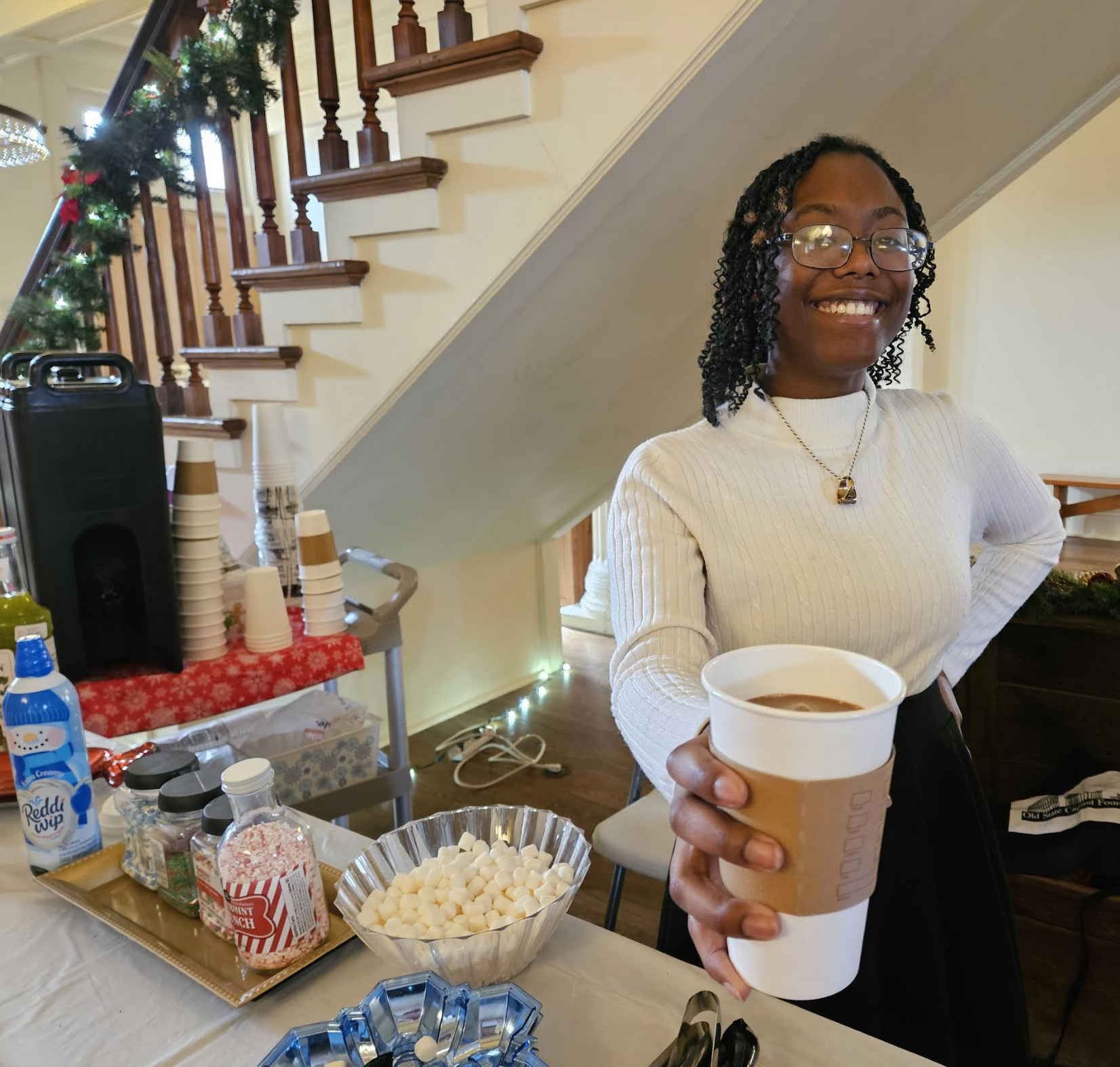 Next on our schedule was “Cocoa at the Old Capital” so we headed the short distance. It was just like a Hallmark Movie– building a cocoa stop on our trip. Once we got to the Old State Capitol, who did we run into again, but Klein– or should we say, Abraham Lincoln, as well as Santa Claus and the people handing out the hot chocolate for $3 a cup.
