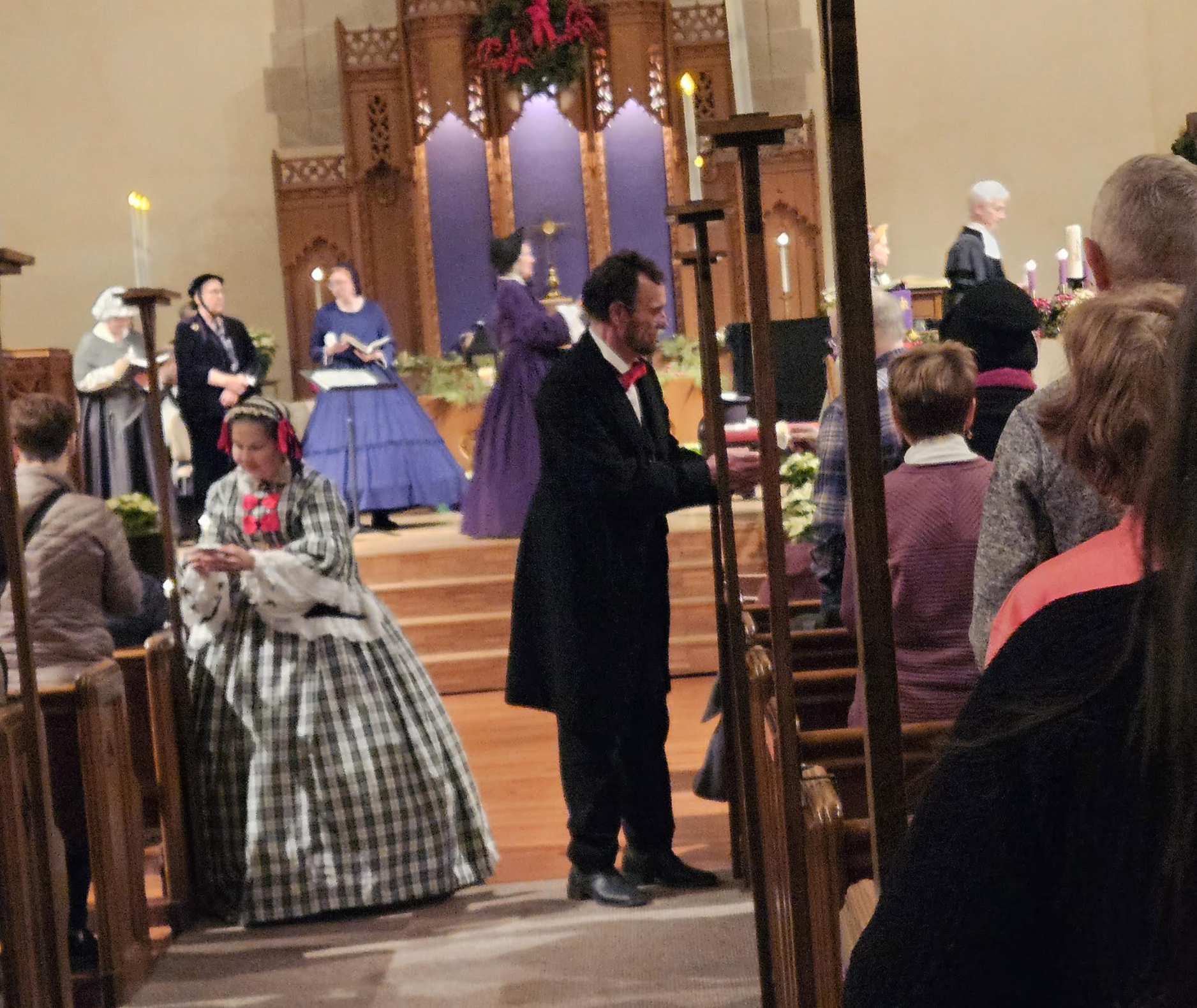 After dinner the thing we had been most looking forward to happened in the church where Abraham Lincoln and his family went: The 1850’s Community Christmas Carol Sing event with participants in costume.