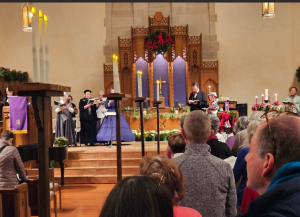 The evening was full of Christmas Carols and in between there were Bible verses about the birth of Christ read. They had passed out candles and near the end, Abe and Mary walked through the church offering a light from their candles to help everyone light theirs and then everyone held their lighted candles up in a darkened church and sang “Silent Night.”