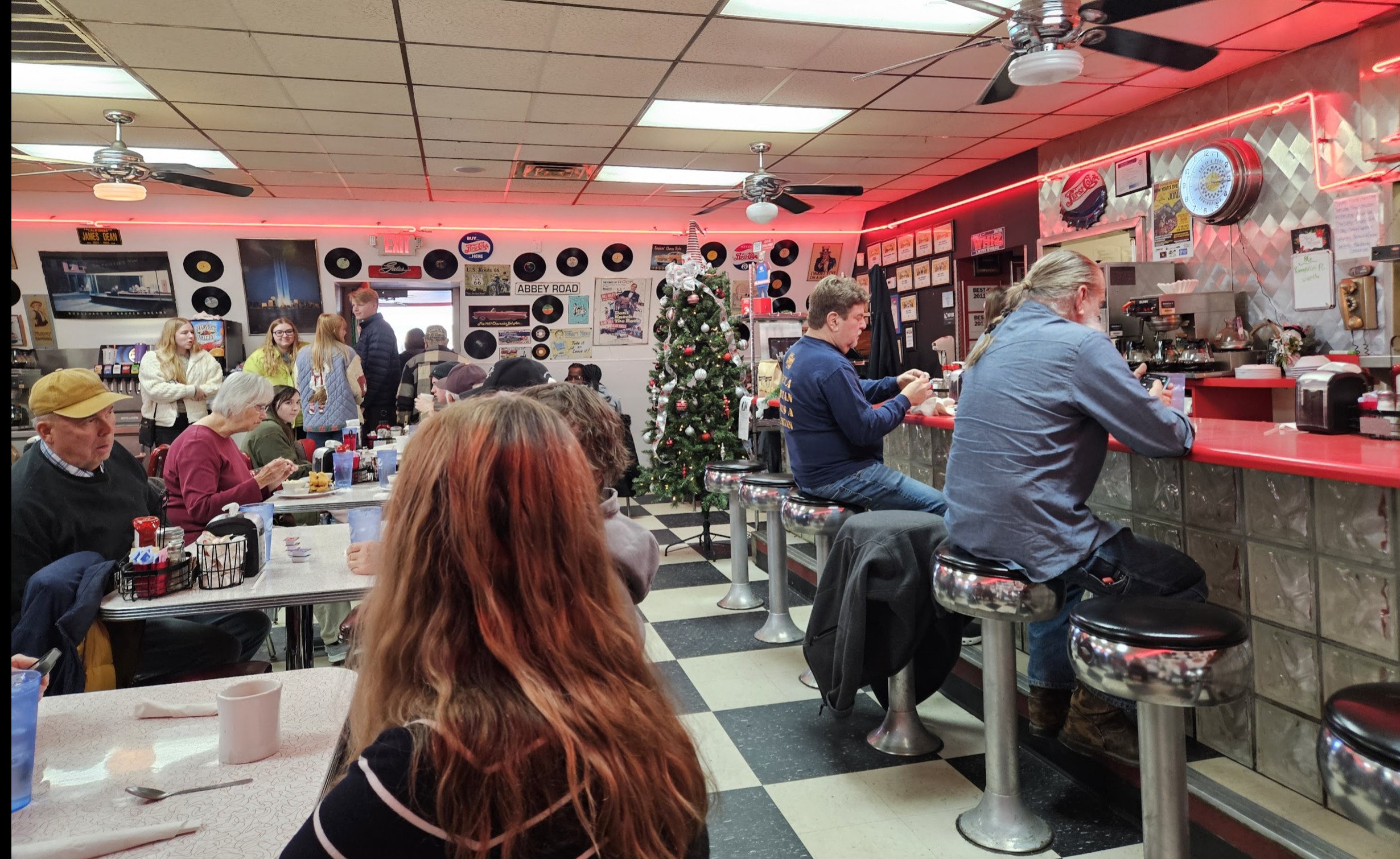 The whole decor of Charlie Parker’s was a lot of fun and it was dressed up festively for the season with a big Christmas tree. You can see the Elvis photo in the photo of Pat with the pancake as well as the tree in the larger photo.