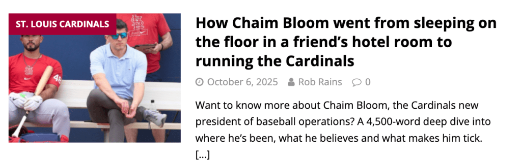 About a week after he officially took over the duties of president of baseball operations for the Cardinals, we published an in-depth profile of Chaim Bloom. This 4,500-word story detailed where he’s been, what he believes and what makes him tick. If you missed the story when it was published on Oct. 6, you can read it by CLICKING HERE