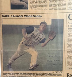 When he was 14 years old he made the front page of the Joplin Globe, shown left, after making a diving catch during the NABF (National Amateur Baseball Federation) World Series, who bill themselves as the oldest continuously operated national amateur baseball organization in the U.S. having started in 1914.