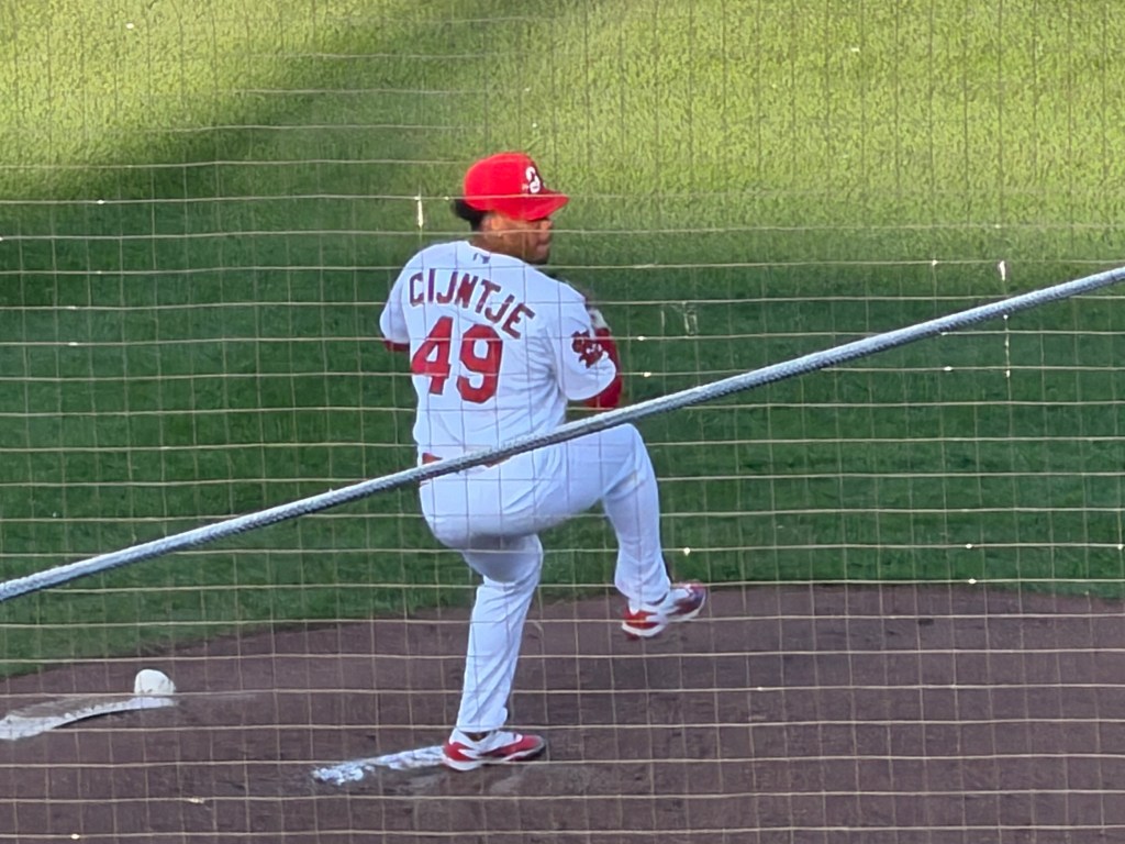 Before each inning, Cijntje – acquired from Seattle in the Brendan Donovan trade – took warmup pitches as both a lefthander and righthander.