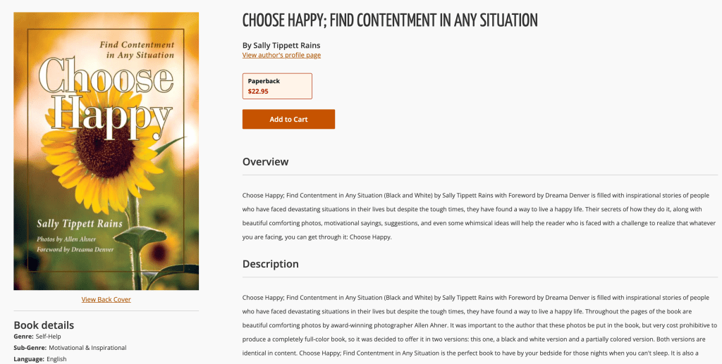 Choose Happy; Find Contentment in Any Situation by Sally Tippett Rains with Foreword by Dreama Denver is filled with inspirational stories of people who have faced devastating situations in their lives but despite the tough times, they have found a way to live a happy life.