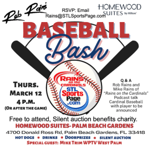 Please RSVP if you can– tell the front desk if you are staying at the hotel or email us: Rains@STLSportsPage.com. Thanks to the Homewood Suites, Palm Beach Gardens for their sponsorship of this fun event.