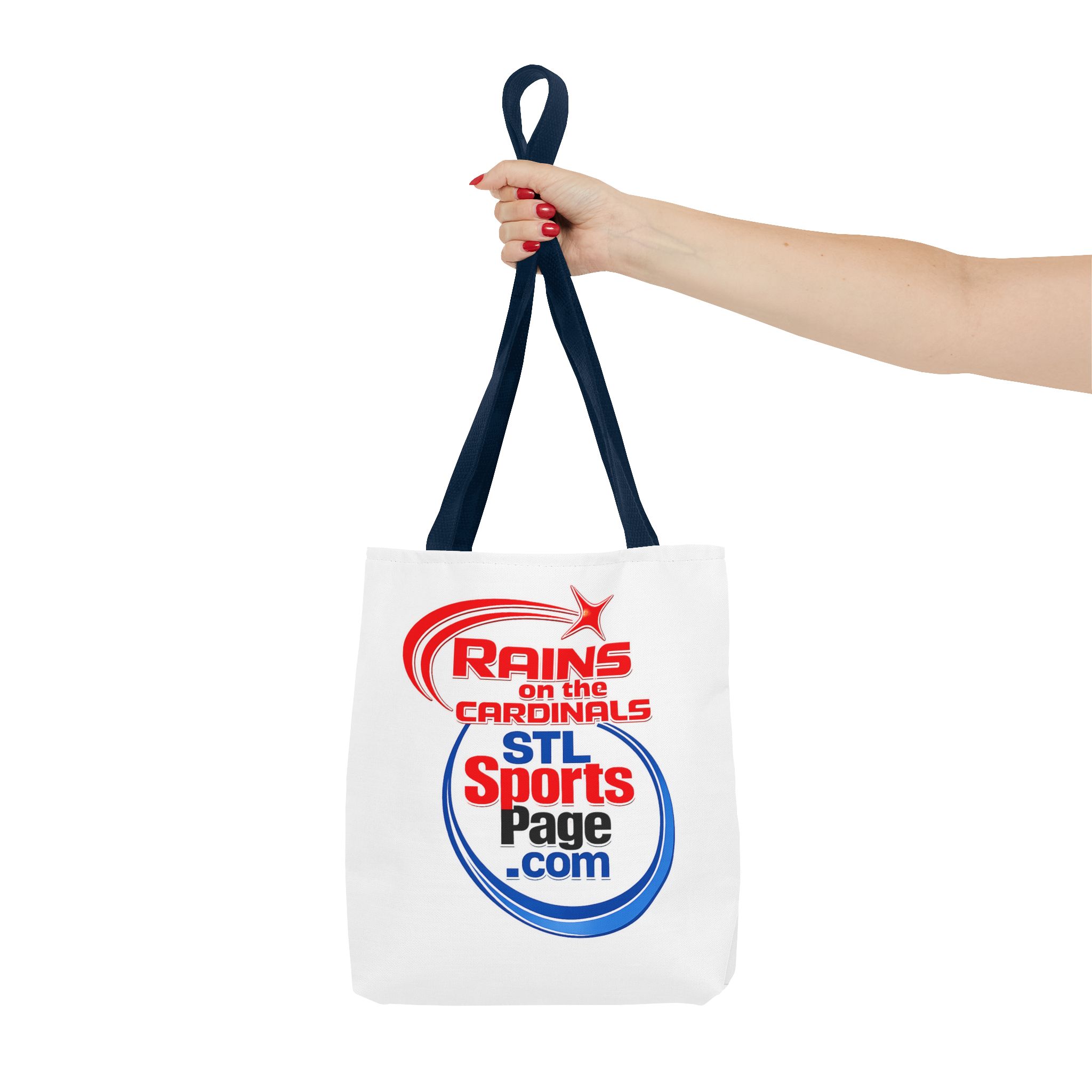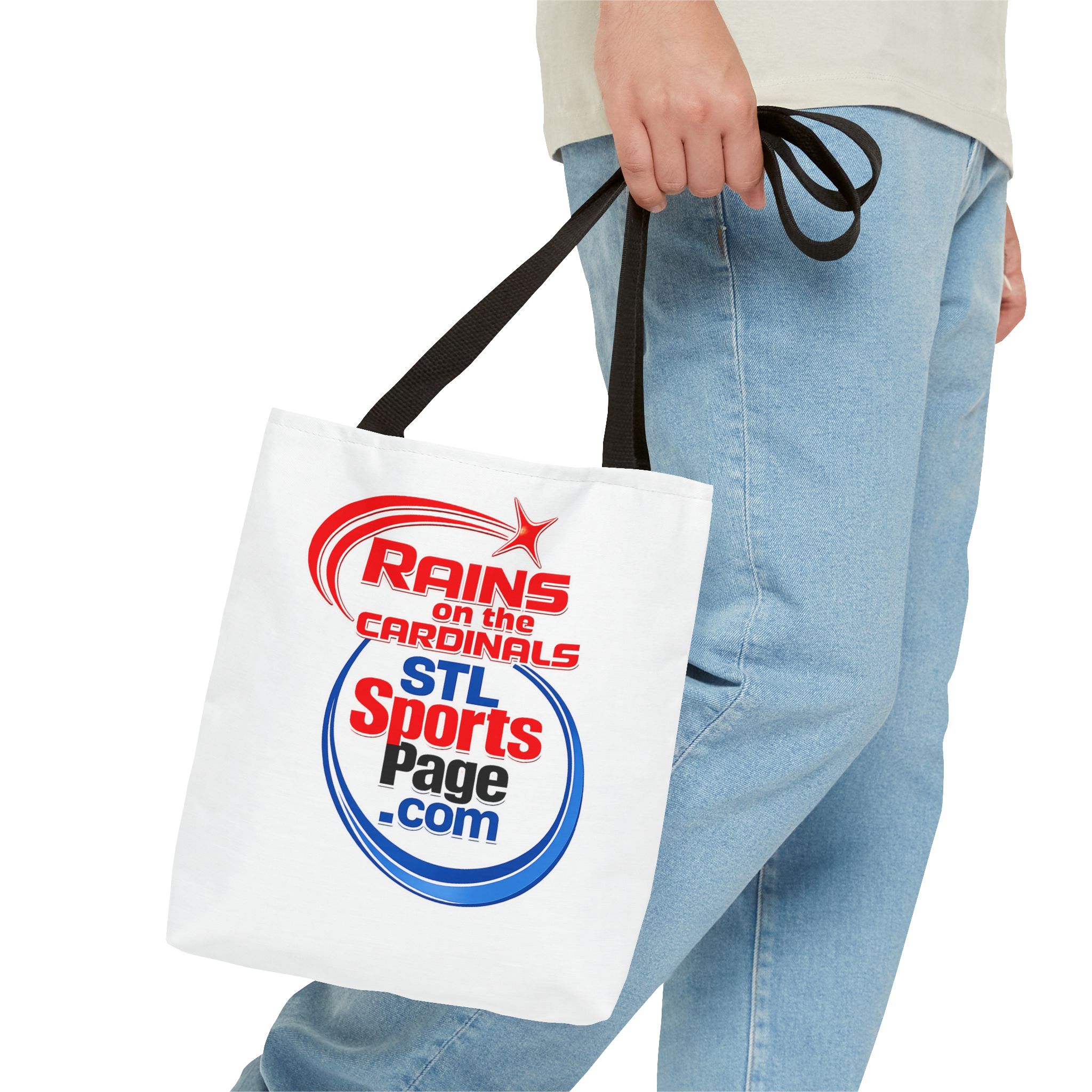 he bright, circular STL Sports Page logo and dynamic “Rains on the Cardinals” mark pop against a clean white field, creating a sporty look that stands out at practice, the game, or on the way to work. The bag feels solid in hand — structured boxed corners give it extra room for programs, water bottles, and a light jacket, while the reinforced handle stitching keeps everything secure. Lightweight polyester dries quickly if it gets damp, and the subtle inner laminate helps items keep their shape. Choose a handle color to match your vibe and pick the size that fits your load. It’s the kind of bag fans reach for instinctively: simple, durable, and loud about who you root for.